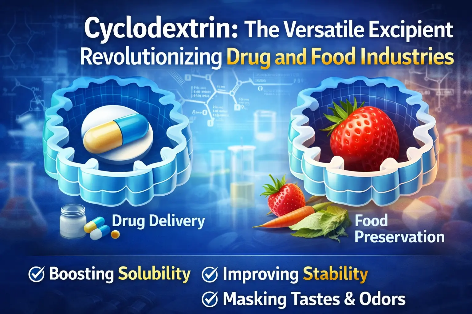 Penemuan siklodekstrin merupakan salah satu langkah maju terpenting dalam sejarah pangan dan obat-obatan. Oligosakarida siklik yang terbentuk secara alami ini telah mengubah cara kita memberikan obat, menjaga makanan tetap segar, dan menggunakan banyak bahan kimia lainnya dalam industri. Produk ini membuat kompleks inklusi yang mengatasi masalah penting di banyak bidang berkat struktur molekulnya yang khas, yang memiliki rongga dalam hidrofobik dan permukaan luar hidrofilik. Eksipien fleksibel ini mengubah ilmu formulasi dan proses manufaktur di seluruh dunia. Ia dapat melakukan segalanya mulai dari meningkatkan penyerapan obat hingga menyembunyikan rasa tidak enak pada obat.
