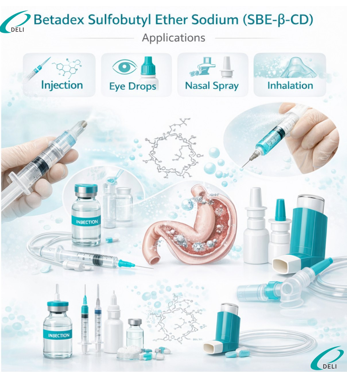 Kelas Injeksi Betadex Sulfobutyl Ether Sodium CAS 182410-00-0 adalah turunan beta-siklodekstrin anionik berkinerja tinggi yang diproduksi oleh Xi'an DELI Biochemical Industry Co., Ltd. Ini dikembangkan sebagai eksipien farmasi untuk meningkatkan kelarutan, stabilitas, dan keamanan bahan aktif farmasi yang sulit larut dalam air.